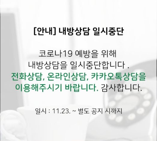 내방상담을 제외한 비대면 상담은 가능하오니 전화상담, 온라인상담, 카카오톡상담을 이용해주시기 바랍니다.