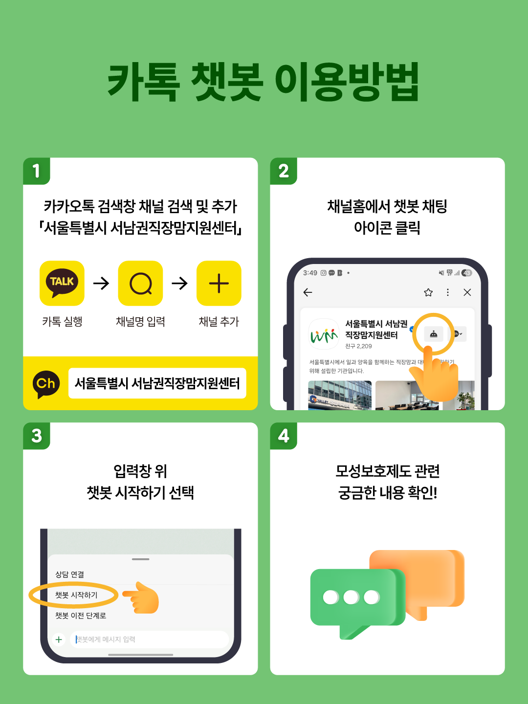 서울시 서남권직장맘지원센터가 카카오톡 채널 상담 챗봇 '맘편한 톡' 서비스를 운영합니다.