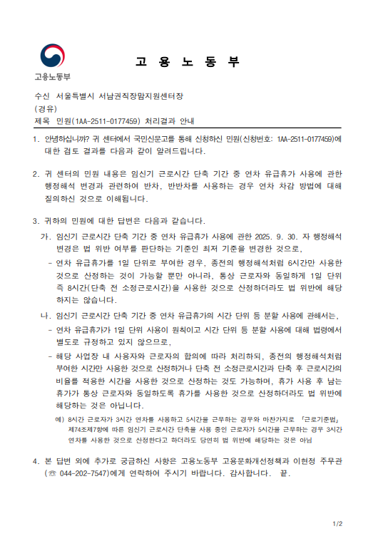 - (변경 행정해석) e와 같이 휴가 사용 후 남는 휴가가 통상 근로자와 동일하도록 휴가를 사용한 것으로 산정하더라도 법 위반에 해당하지 않음. 끝.
