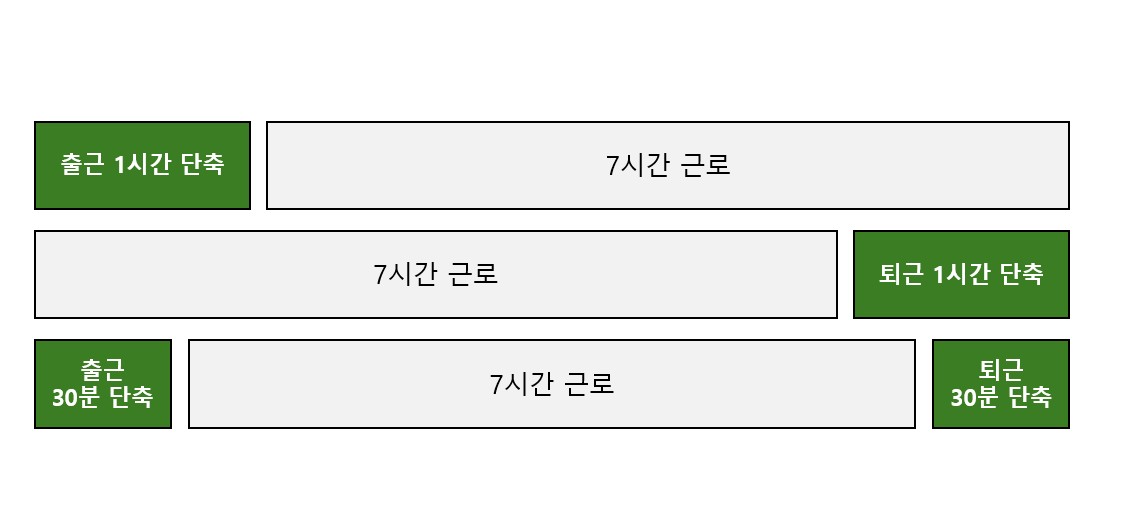 예컨대, 1일 소정근로시간이 8시간 근로자가 육아기 10시 출근제를 사용해 1일 7시간만 근로하는 경우, 아래 그림과 같이 ▲1시간 늦은 출근, ▲1시간 이른 퇴근, ▲출근 시간을 30분 늦추고 퇴근 시간을 30분 당기는 방법 모두 가능합니다.
