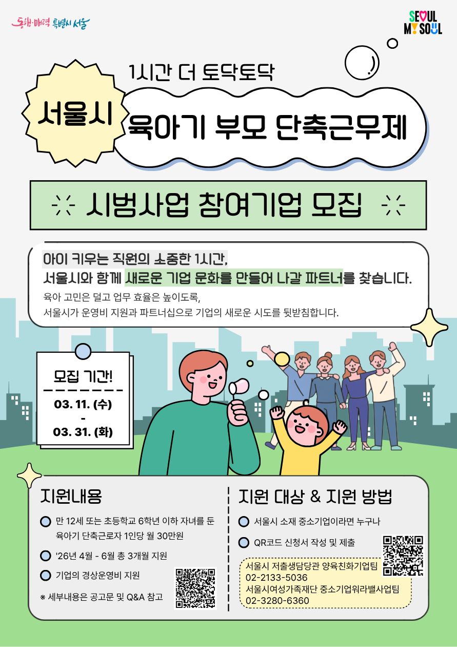 [서울시] 육아기 부모 단축근무제 지원 시범사업 참여 기업 모집 공고