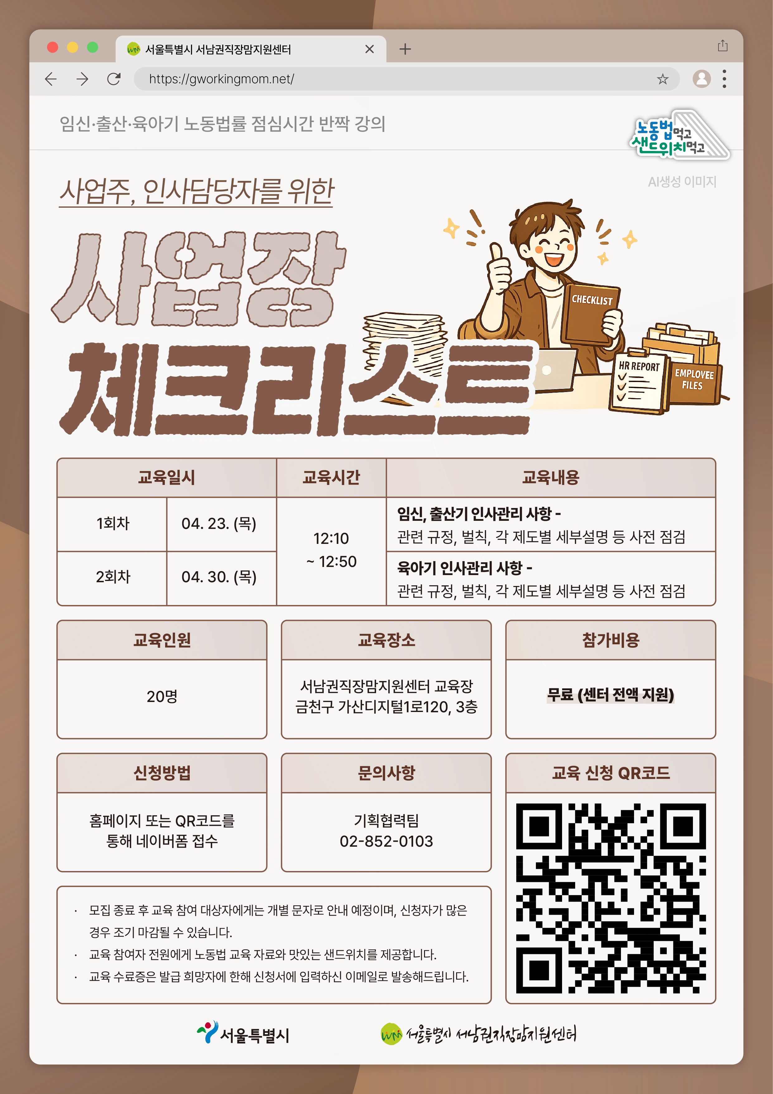 서울시 서남권직장맘지원센터에서는 사업주와 인사담당자를 위한 임신·출산·육아기 인사관리 체크리스트 교육을 진행합니다.