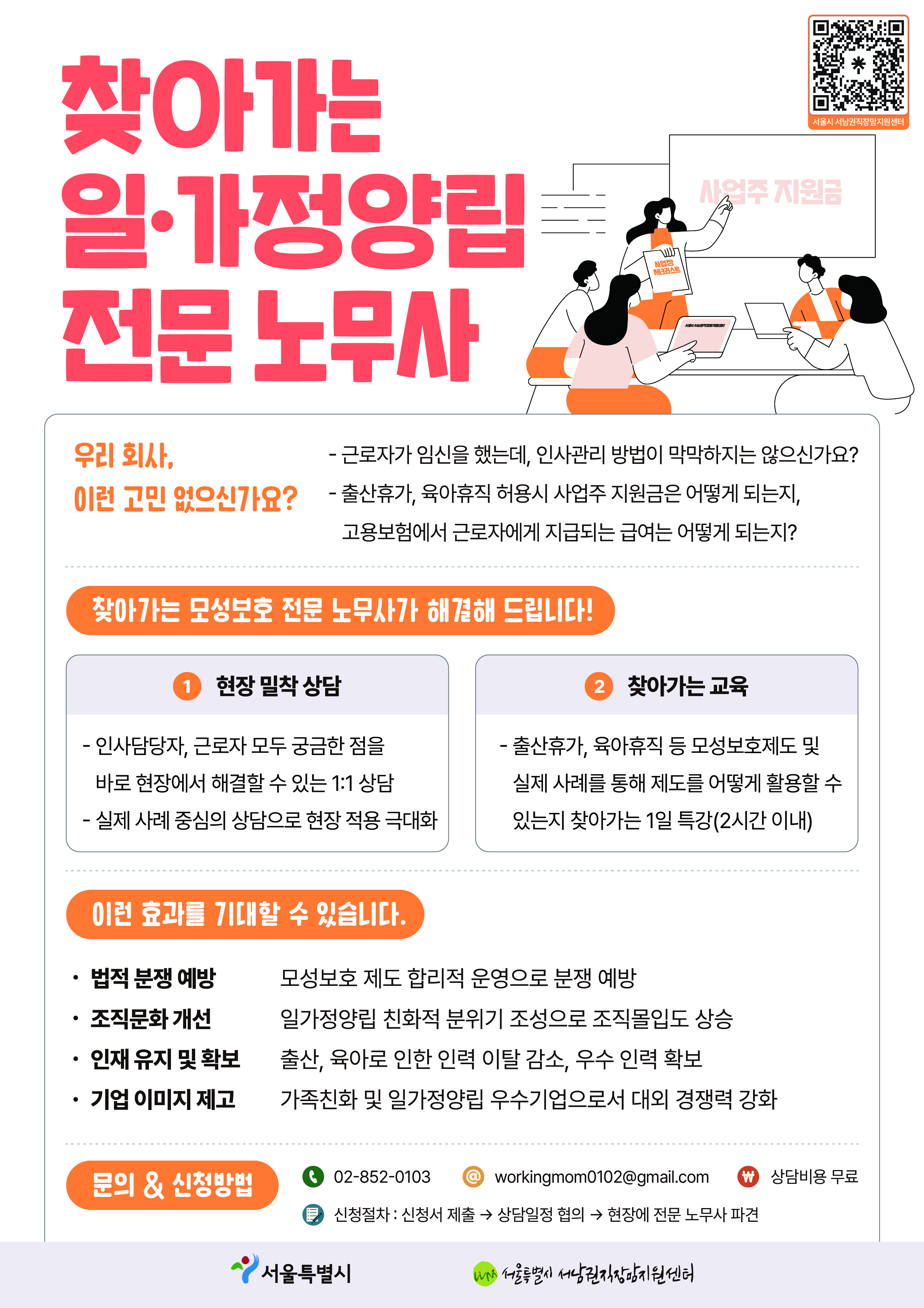 본 사업에 많은 관심 부탁드리며, 일가정양립 전문 노무사가 필요한 사업장이라면 언제든지 문의주세요.