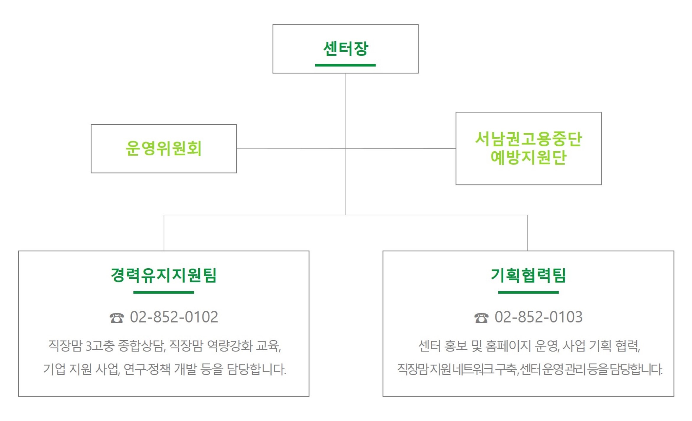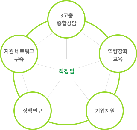 - · 직장맘이 출산과 육아기에 겪는 어려움 등 직장과 가정에서의 다양한 고충 해결을 위해 원스톱 종합상담을 제공합니다.