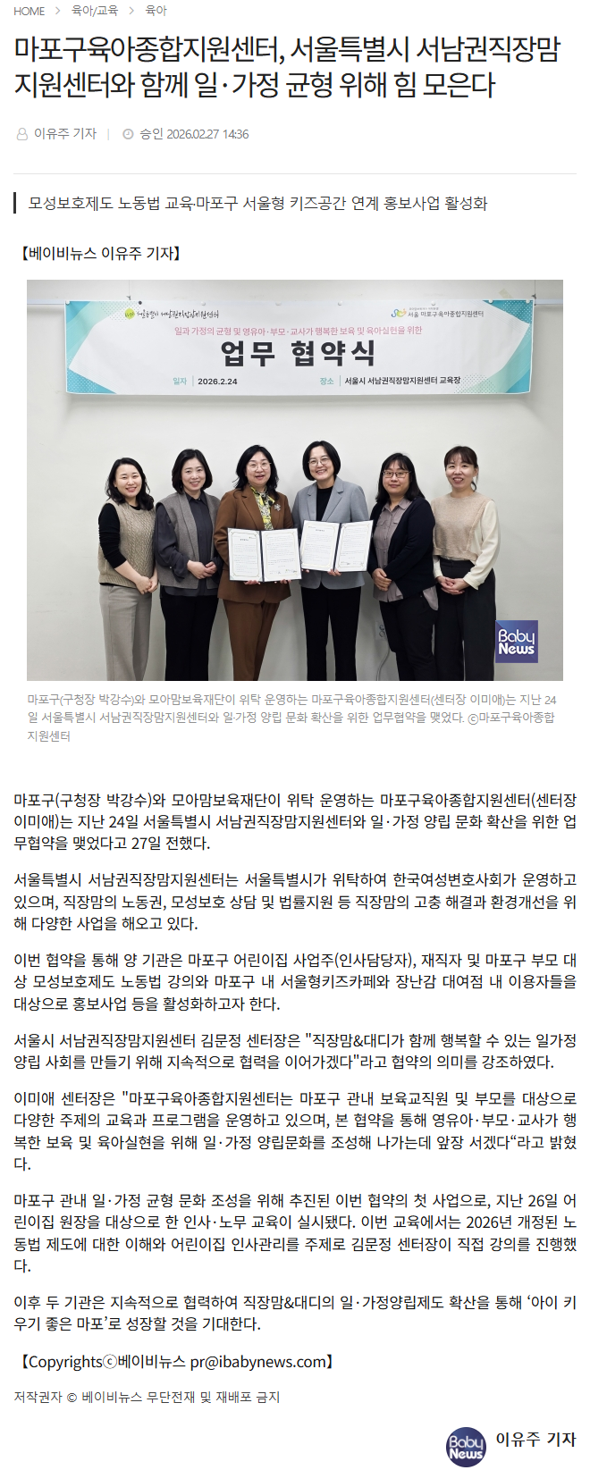 [베이비뉴스] 마포구육아종합지원센터, 서남권직장맘지원센터와 함께 일·가정 균형 위해 힘 모은다