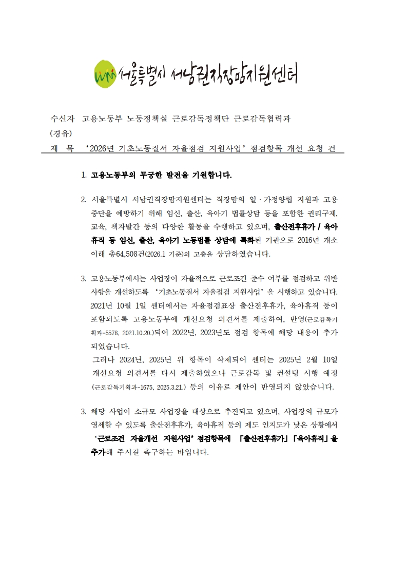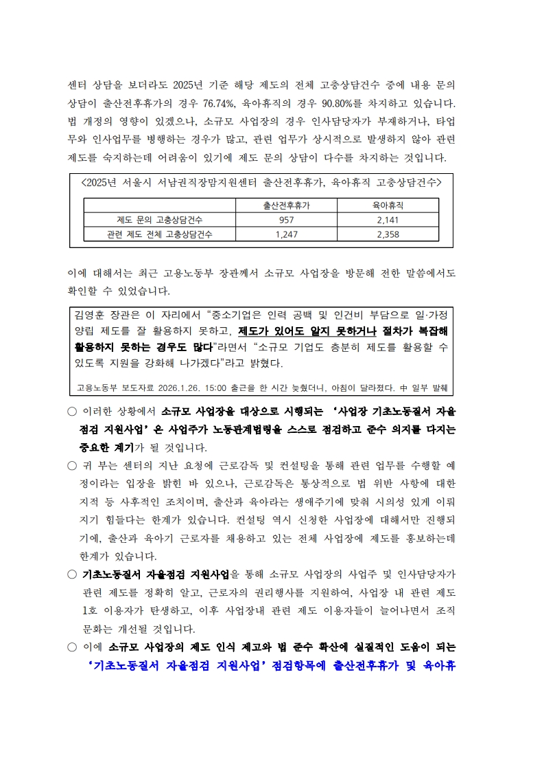 고용노동부는 2026년 근로조건 자율개선 지원사업 점검부터 점검항목에 일·가정 양립 지원 내용을 반영할 예정입니다.