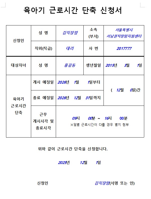 기존 9시~18시 근무자라면, 단축 후에는 9시~15시나 10시~16시처럼 조정된 근무시간을 구체적으로 기재하면 됩니다.