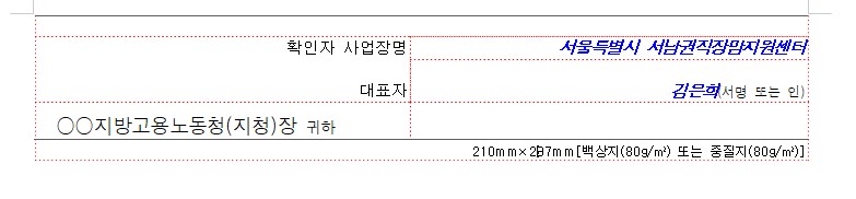 ※ 위 서식은 센터에서 제공하는 표준 서식이며, 회사에서 자체적으로 마련한 내부 서식을 활용하셔도 무방합니다.