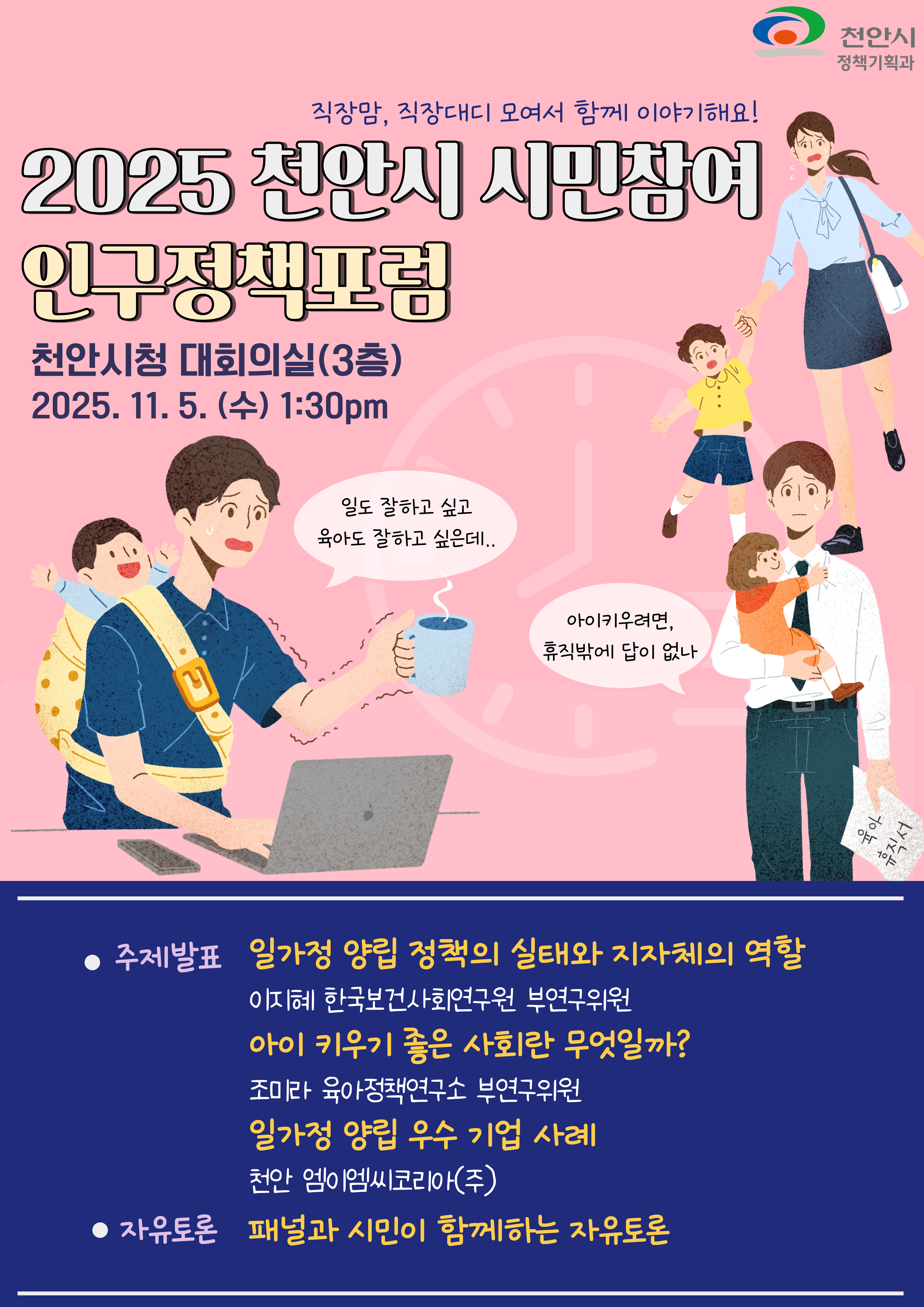 천안시가 다음 달 5일 시청 대회의실에서 '2025 천안시 시민참여 인구정책포럼'을 개최합니다.